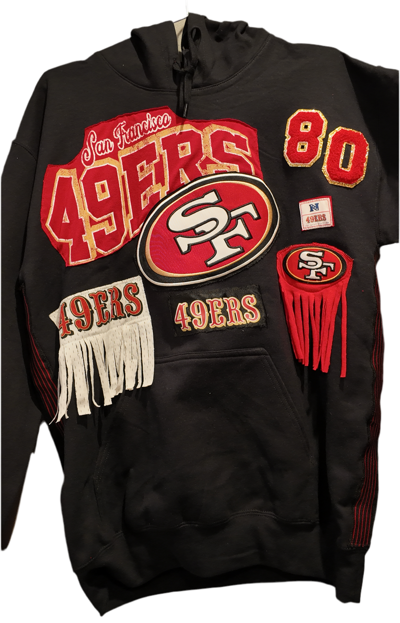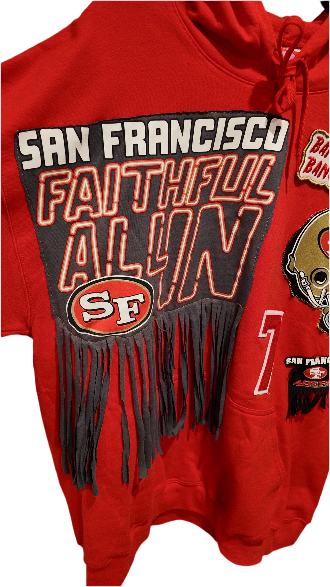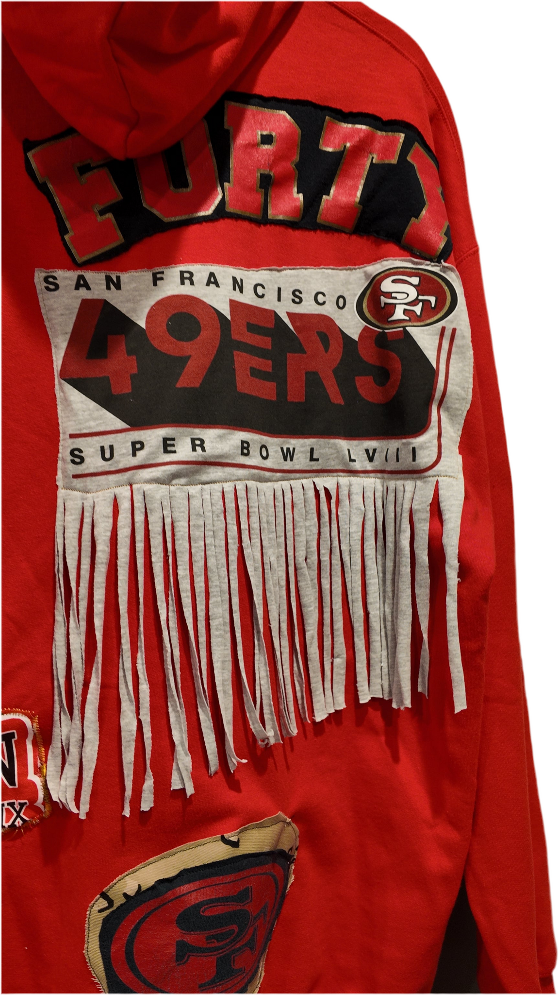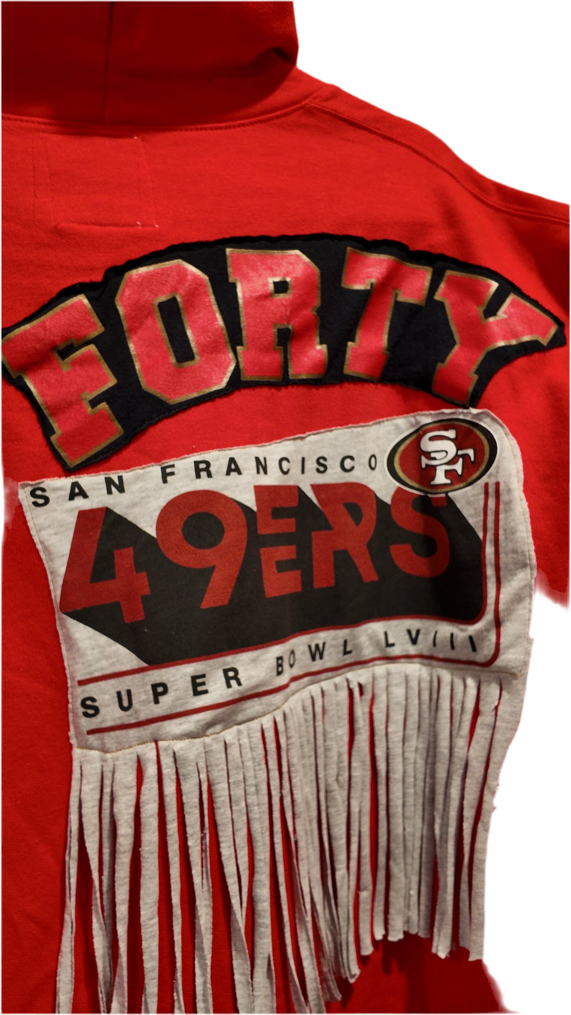 Rep your team with a piece that’s as bold as your faithfulness. This handmade hoodie is crafted from a collage of authentic 49ers T-shirts and statement patches, giving it a unique, vintage meets modern edge. No two are alike, each hoodie tells its own story through layered graphics, textures, and details pulled straight from game day classics. Cozy, durable, and full of team spirit, this is the ultimate statement piece for any true 49ers fan. Bang Bang Niner Gang. Also available without the fringe for a more masculine look.