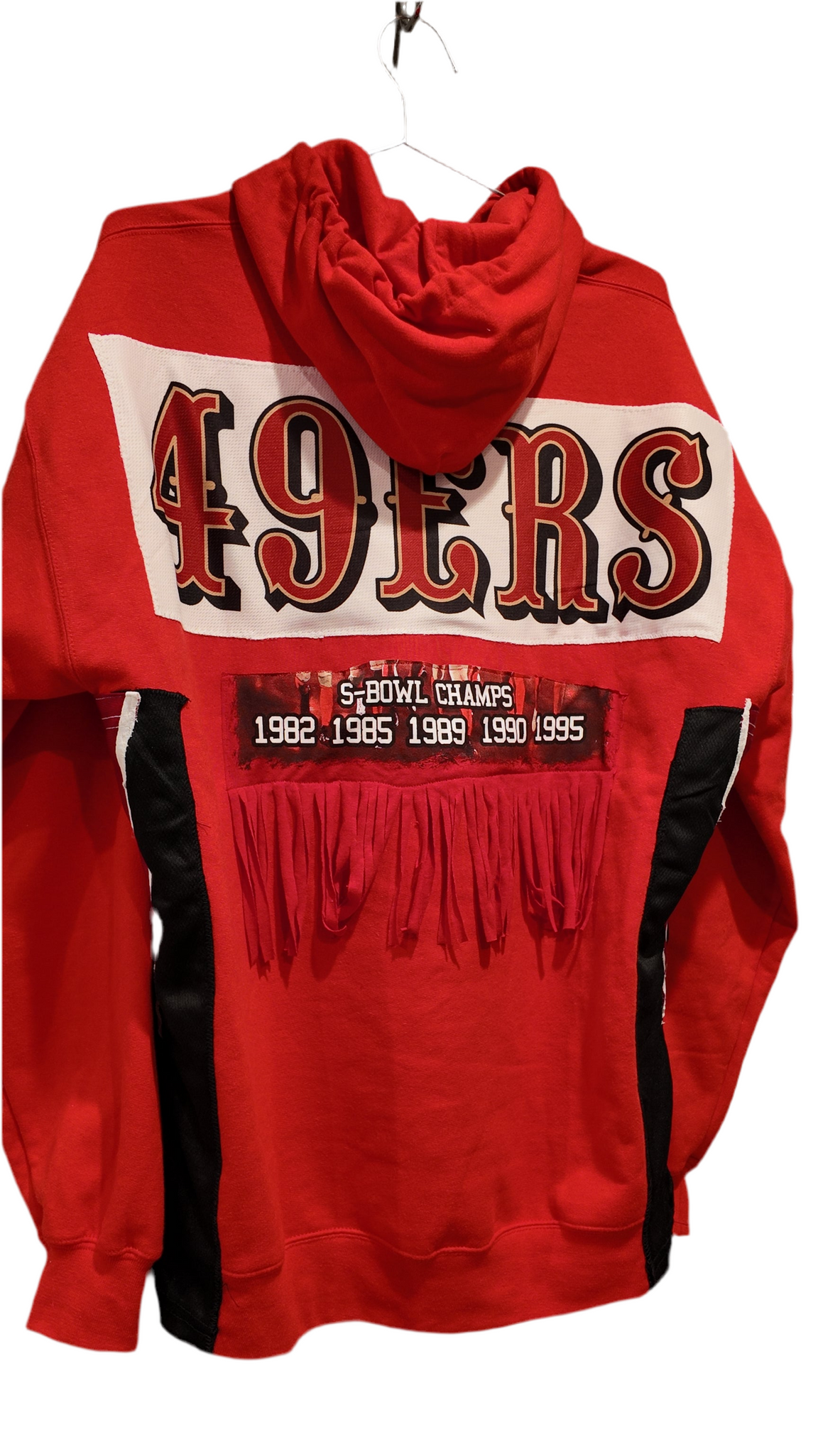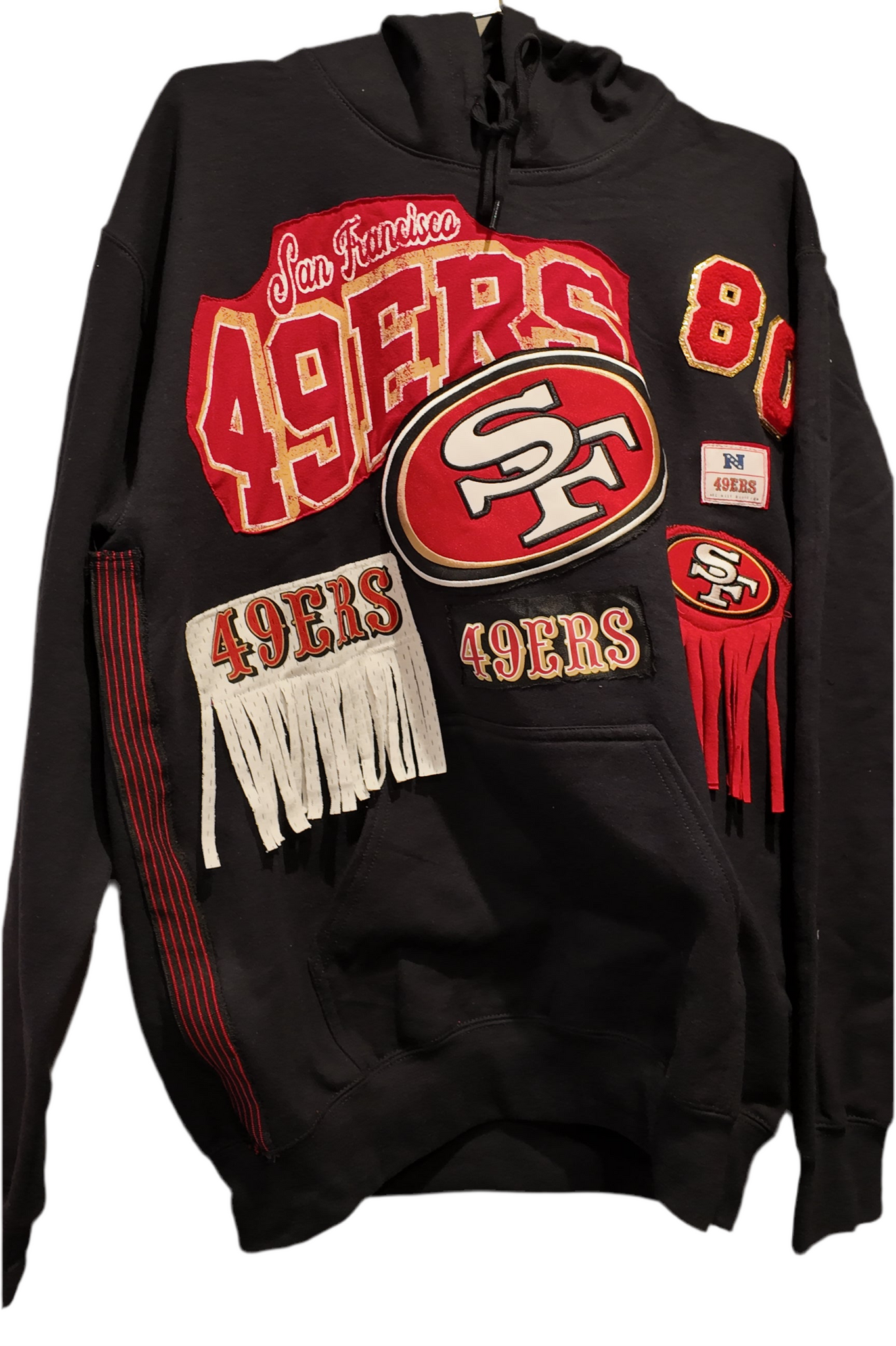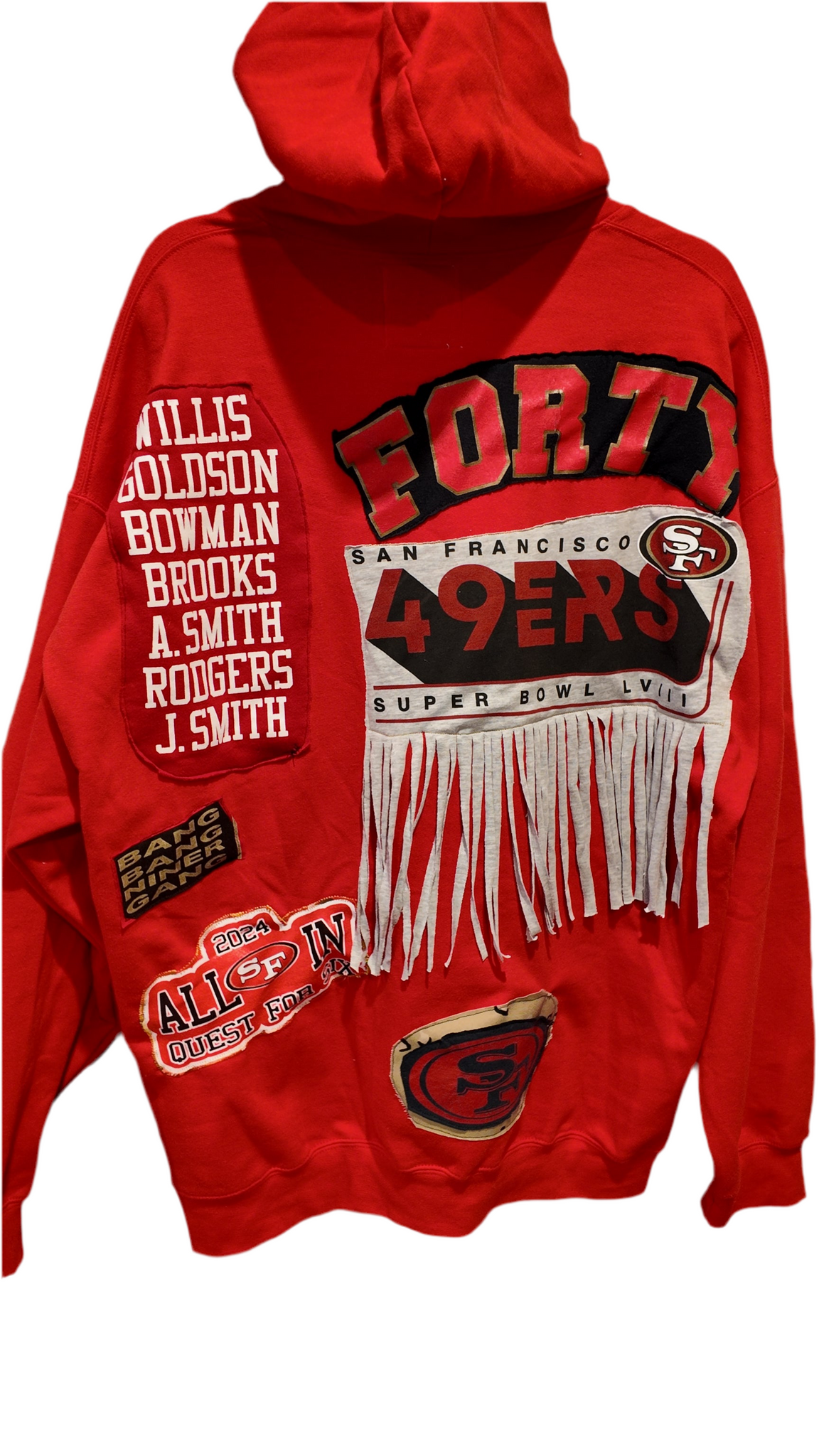 Rep your team with a piece that’s as bold as your faithfulness. This handmade hoodie is crafted from a collage of authentic 49ers T-shirts and statement patches, giving it a unique, vintage meets modern edge. No two are alike, each hoodie tells its own story through layered graphics, textures, and details pulled straight from game day classics. Cozy, durable, and full of team spirit, this is the ultimate statement piece for any true 49ers fan. Bang Bang Niner Gang. Also available without the fringe for a more masculine look.
