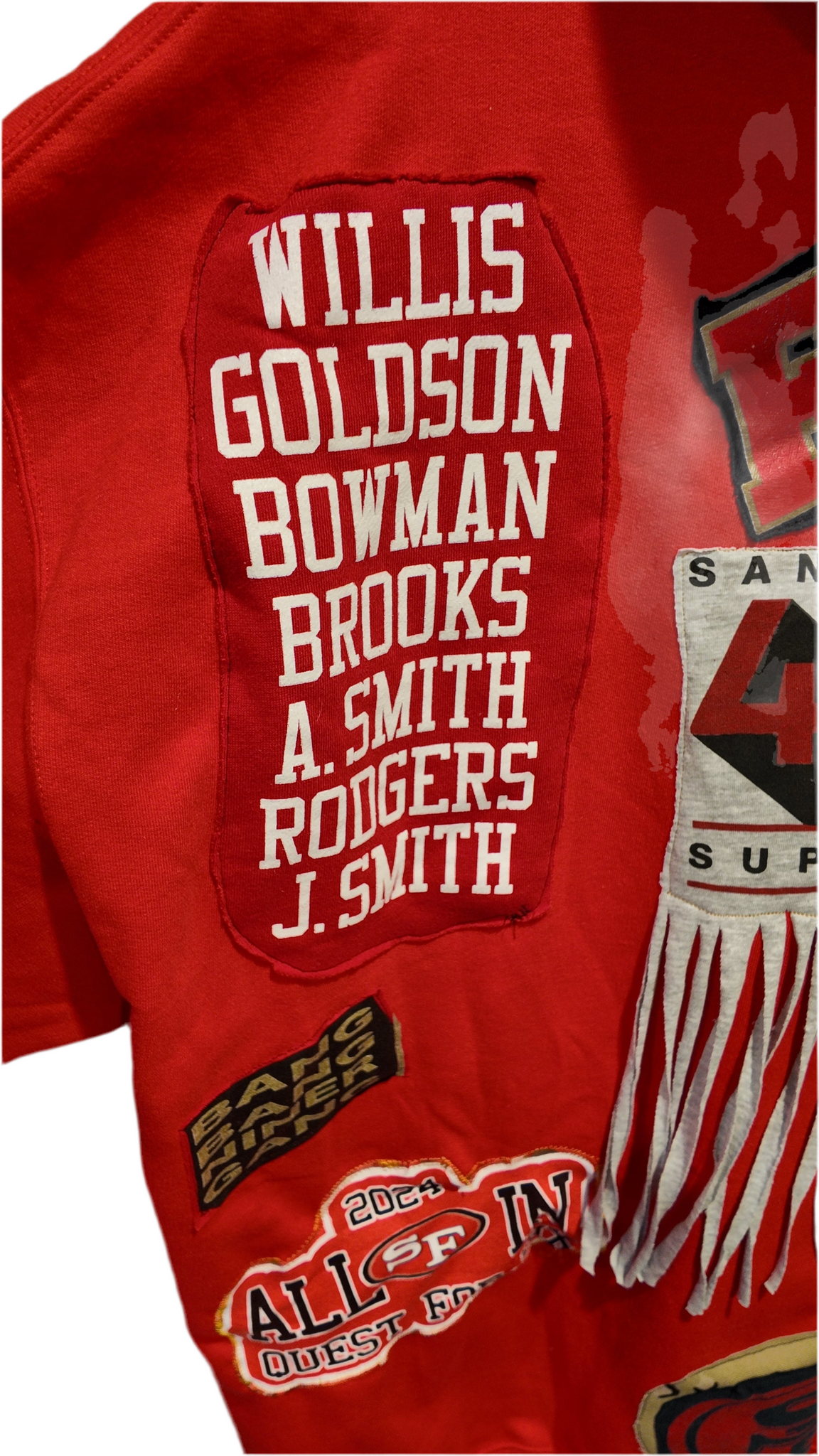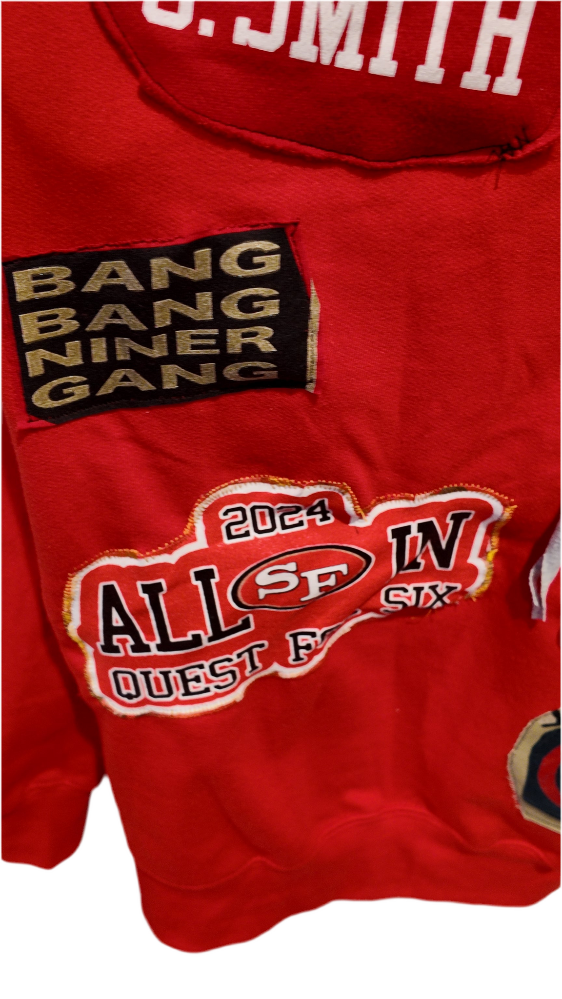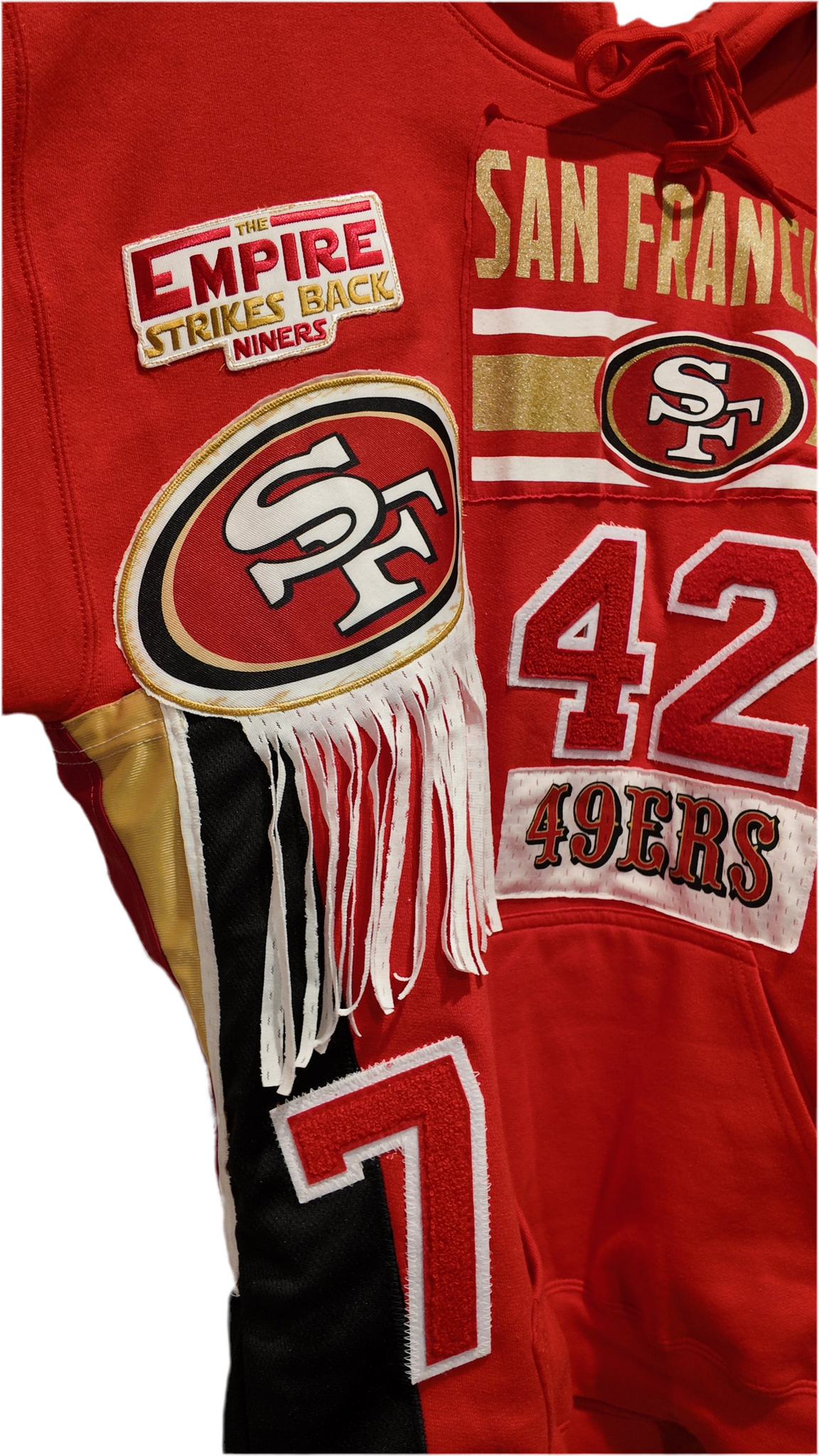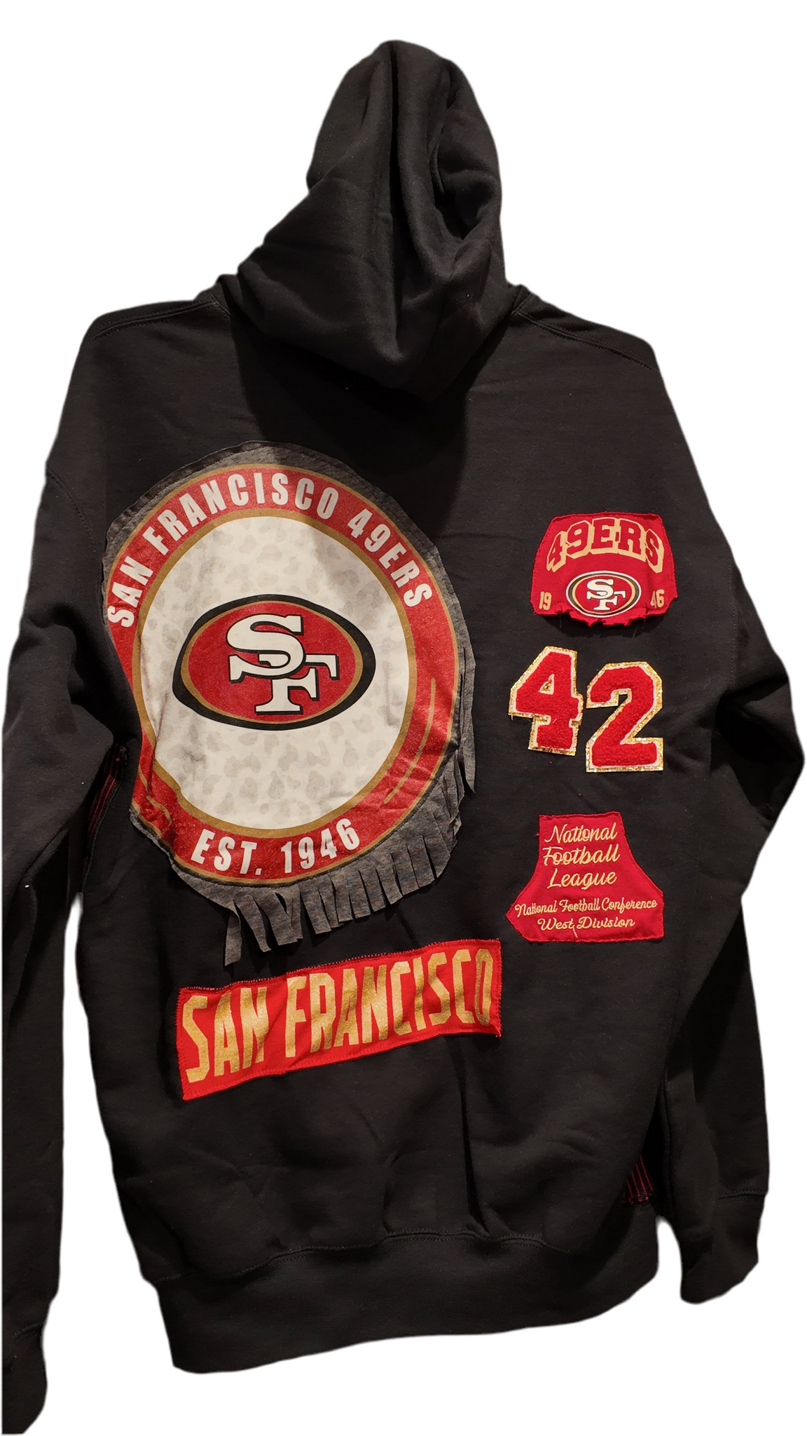 Rep your team with a piece that’s as bold as your faithfulness. This handmade hoodie is crafted from a collage of authentic 49ers T-shirts and statement patches, giving it a unique, vintage meets modern edge. No two are alike, each hoodie tells its own story through layered graphics, textures, and details pulled straight from game day classics. Cozy, durable, and full of team spirit, this is the ultimate statement piece for any true 49ers fan. Bang Bang Niner Gang. Also available without the fringe for a more masculine look.