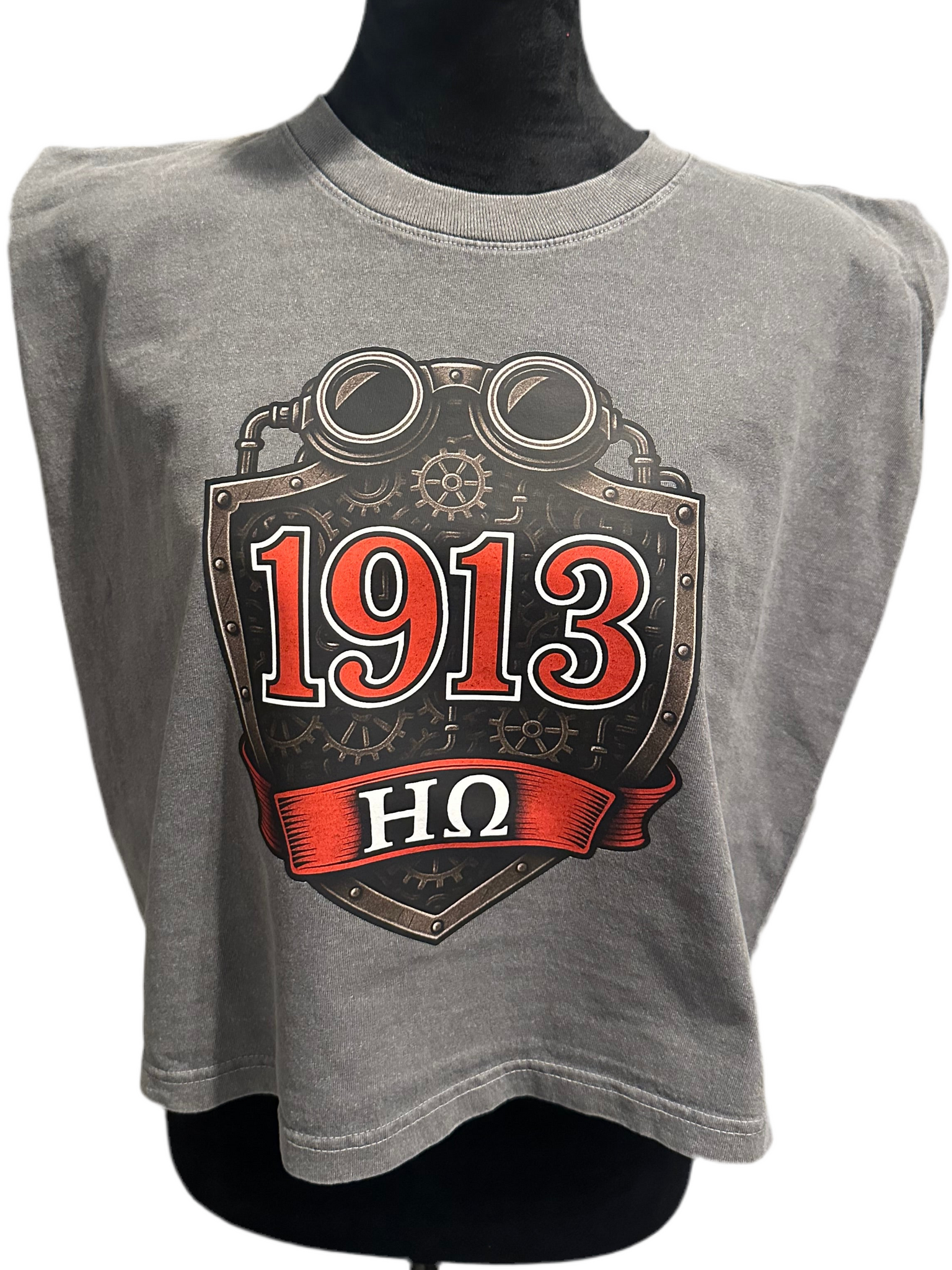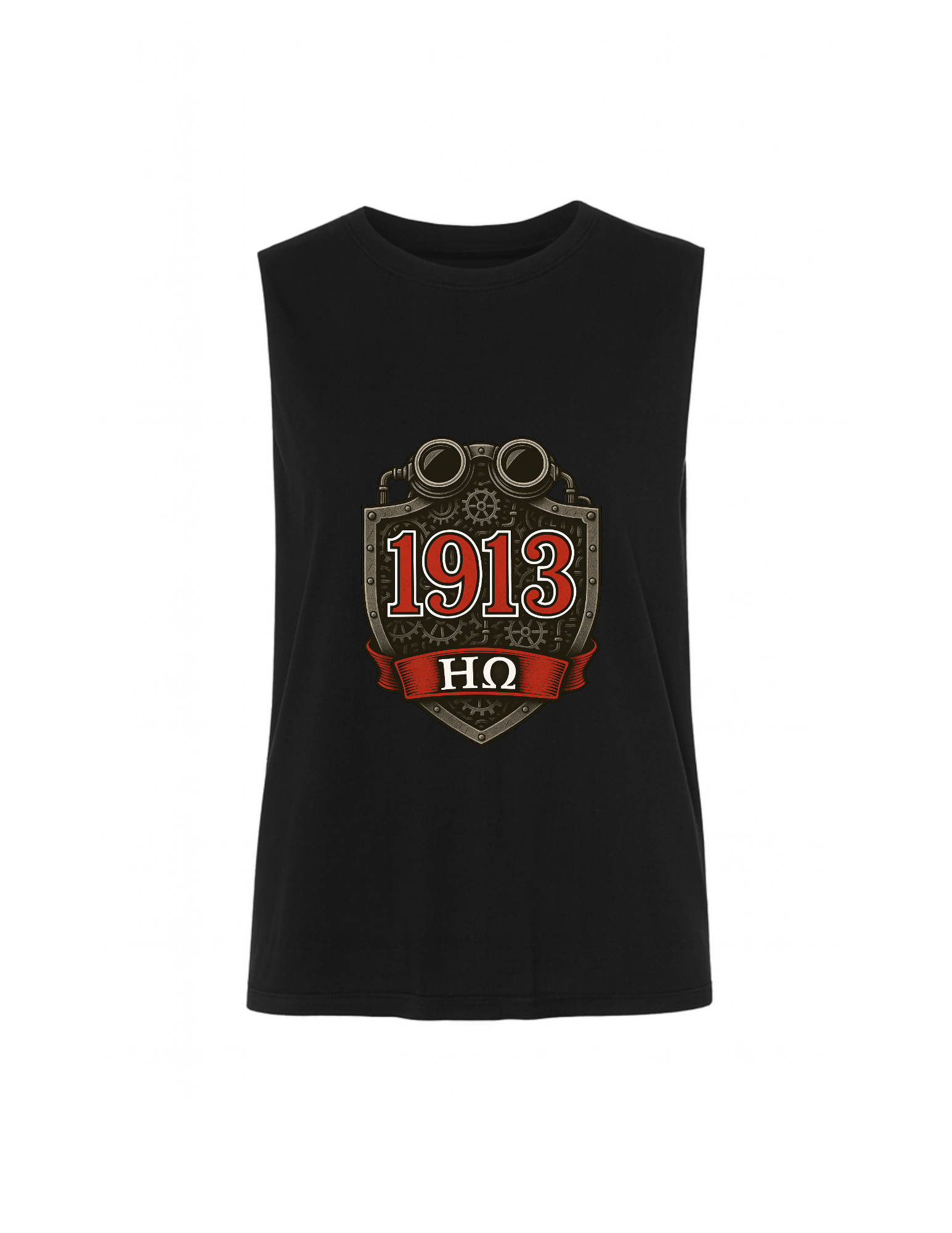 The theme for the team is 1913 Steampunk and this limited edition shield tee blends bold symbolism with industrial flair. It features a striking red 1913 outlined in white across a distressed metallic shield, complete with gears, pipes, and steampunk goggles that nod to power and precision. The ΗΩ banner below pays homage to sisterhood and legacy, making this design both statement and celebration.