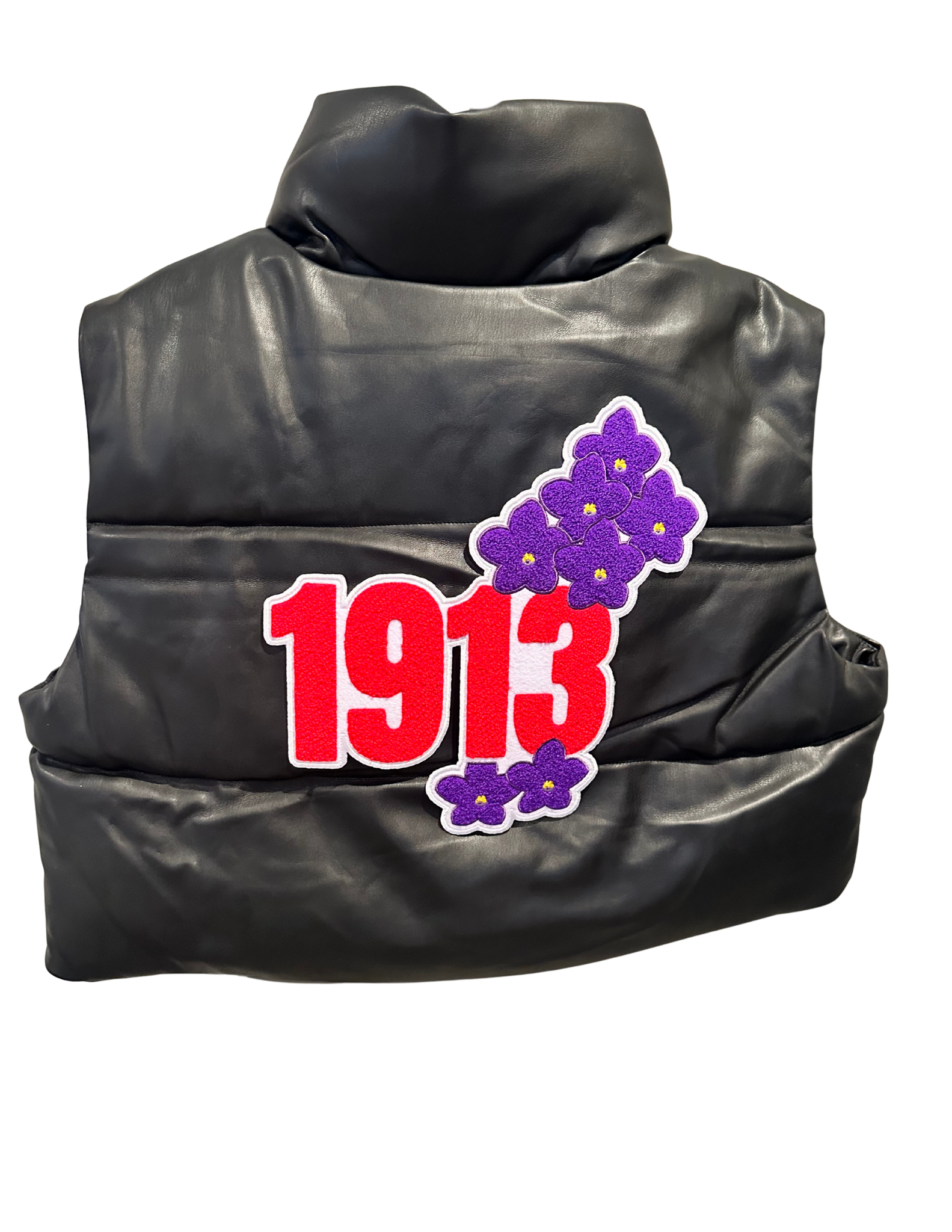 Turn heads with this bold and stylish black faux leather puffy cropped vest, designed with Sorors in mind. This piece blends fashion with sisterhood, featuring premium details and a few unique designs to choose from: