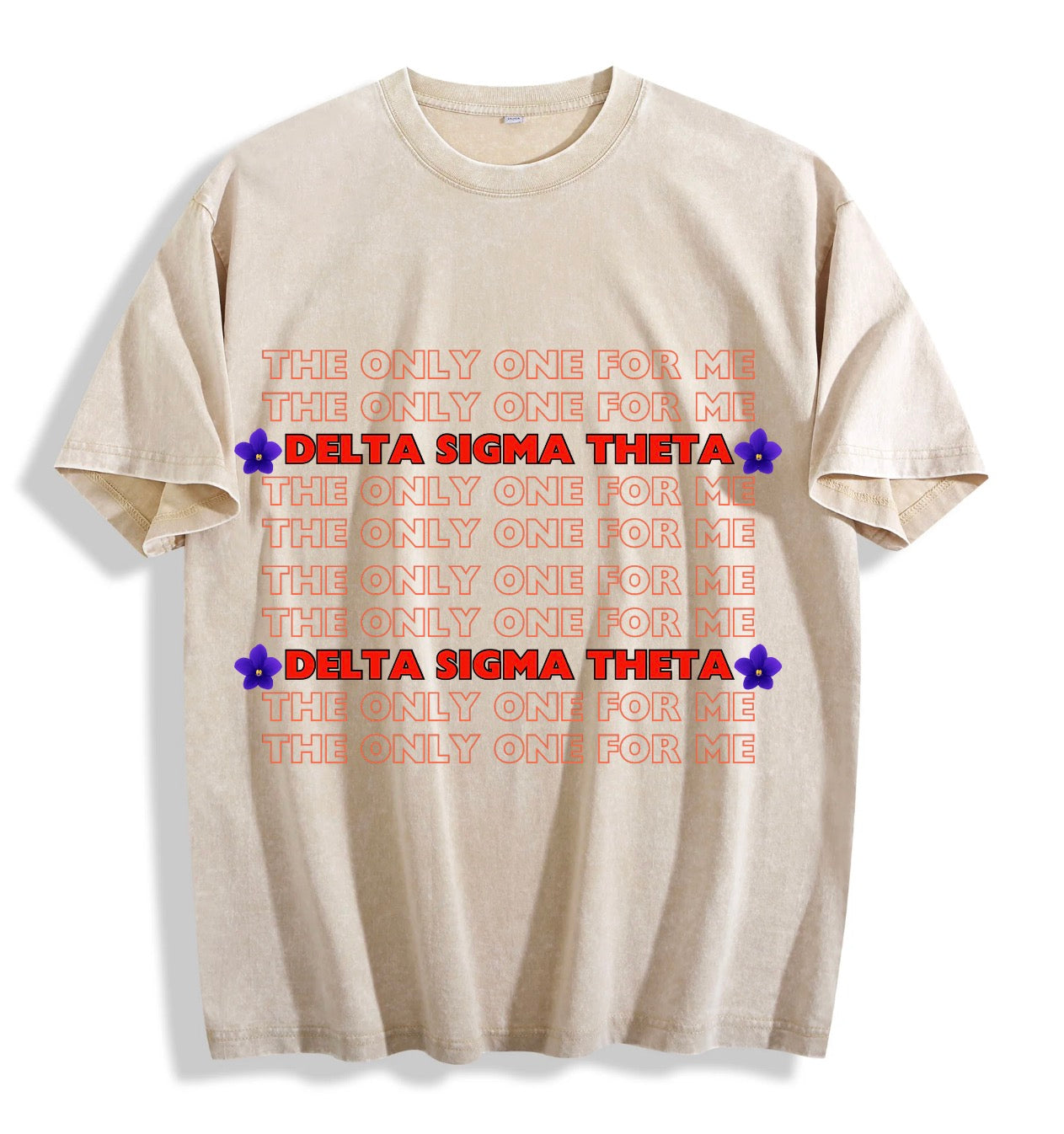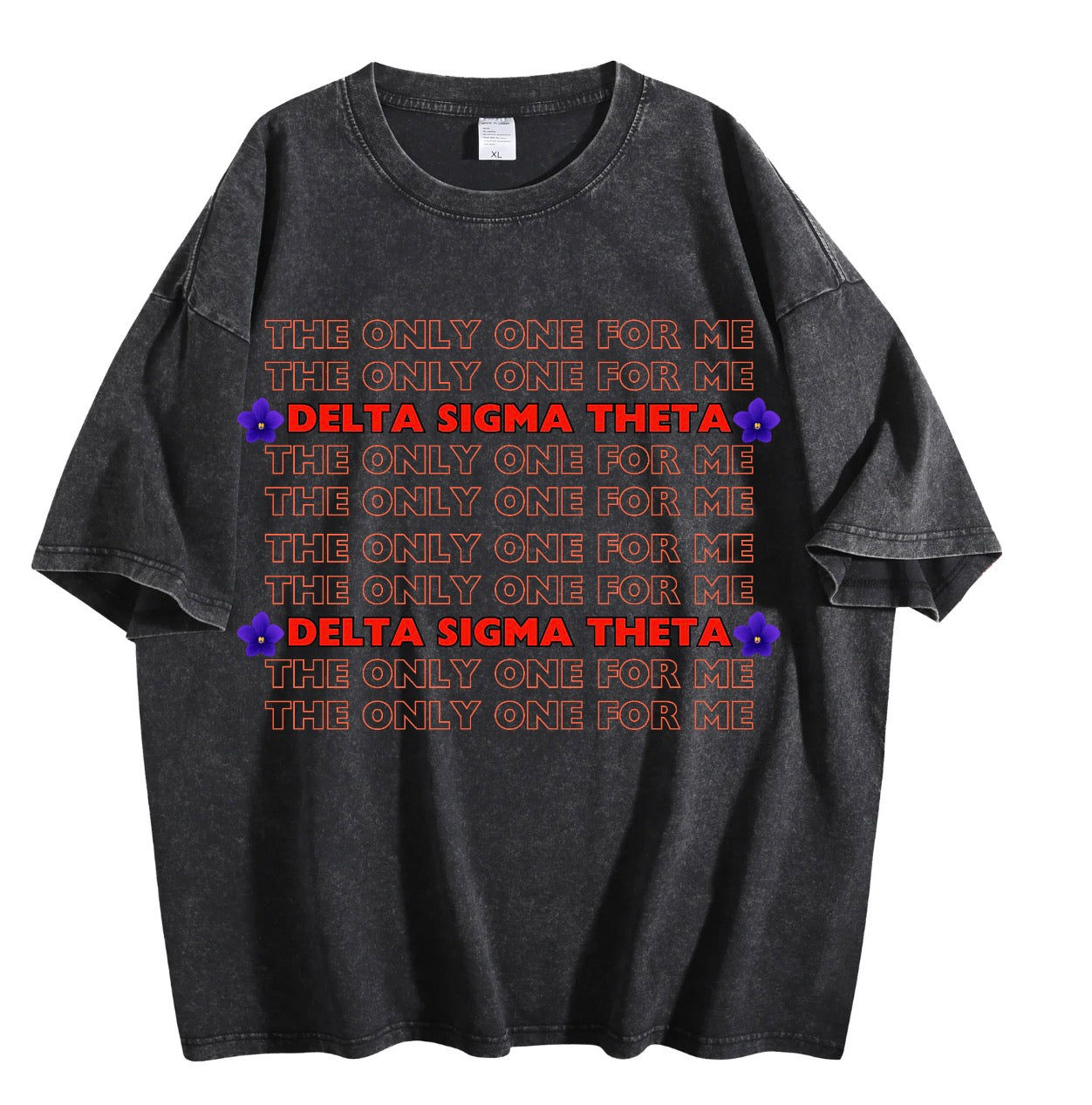 Make a statement that speaks for itself. The Delta Sigma Theta “The Only One For Me” graphic tee blends bold typography with a soft, vintage-washed look for an effortlessly standout piece. Featuring repeated text layered behind striking red lettering and violet accents.
