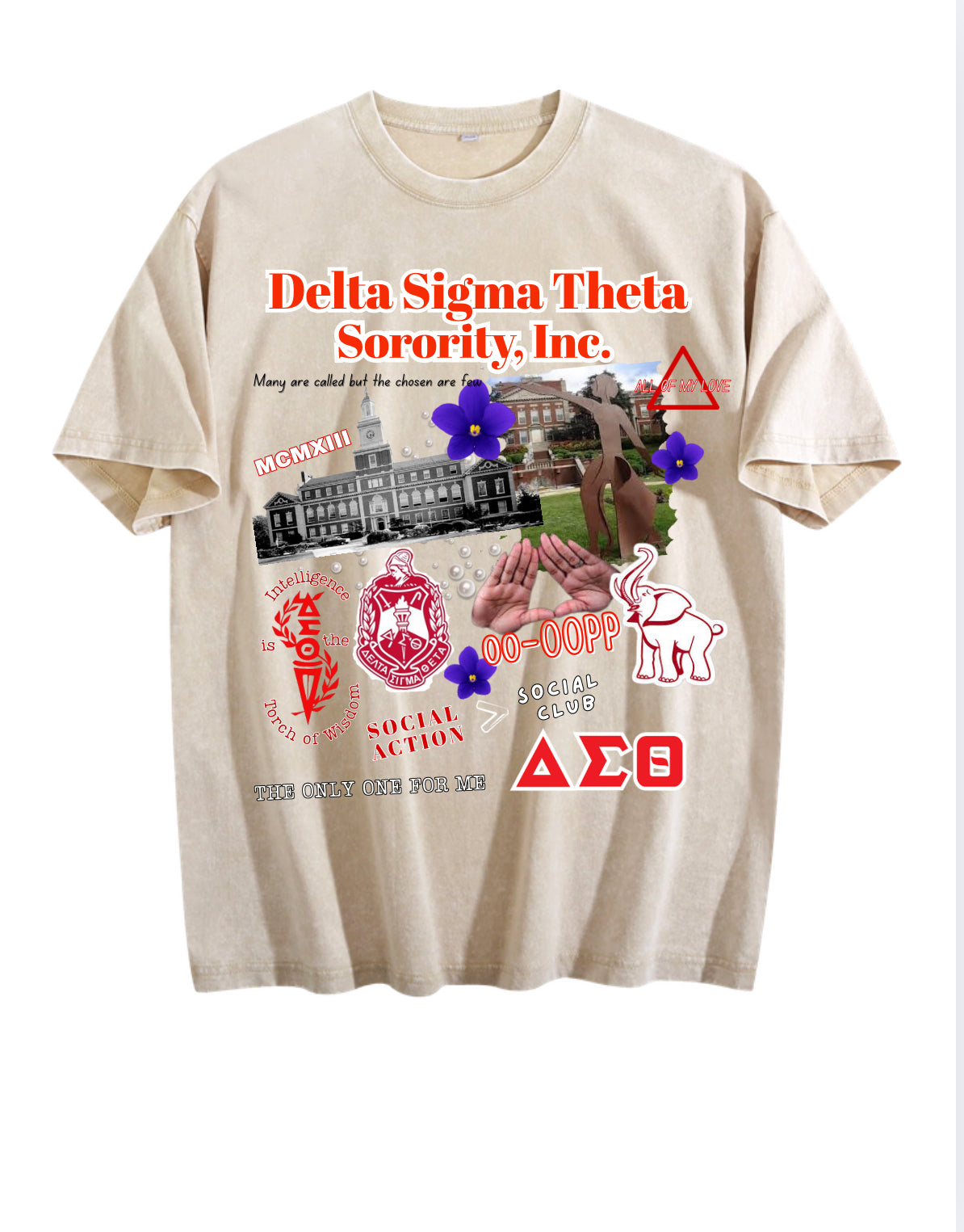 Celebrate sisterhood, service, and style with this statement collage tee honoring Delta Sigma Theta Sorority, Inc.. Designed to embody the essence of scholarship, sisterhood, and social action, this design fuses iconic DST imagery from Founders’ Hall to the beloved elephant and raised hands of devotion.